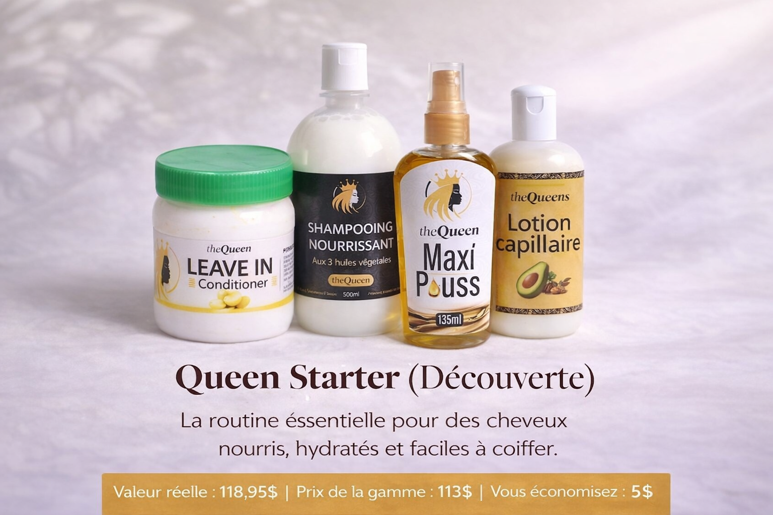 Le gamme Découverte/ The Queen est la routine idéale pour démarrer ou rééquilibrer le soin des cheveux secs, ternes ou déshydratés. Il regroupe des produits nourrissants et hydratants soigneusement sélectionnés pour redonner souplesse, douceur et facilité de coiffage aux cheveux texturés.